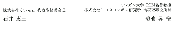 本対談は、くいんと創業40周年を記念し、創業以前からお世話になっております ミシガン大学 RLM名誉教授 /株式会社トヨタコンポン研究所 代表取締役所長 菊池昇 様をお招きして行なった、弊社代表取締役会長 石井惠三との特別対談です。