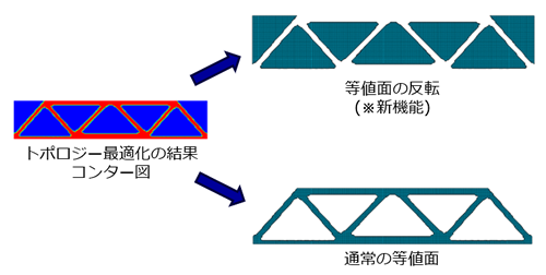 実現した機能は、トポロジー最適化の結果から等値面の表面を抽出し、それをフリップ機能やスムージング機能などで整えて、内部をテトラで分割。 出来たメッシュに対して材料や境界条件をコピーするという処理をワンボタンで実現するというものになります。 工数も手間もかからず、弊社製品の中で完結する目標通りの機能が完成いたしました。