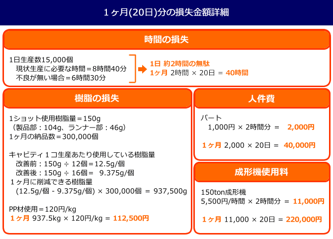 この不良率から様々な面で1か月(20日)分の損失を計算すると…