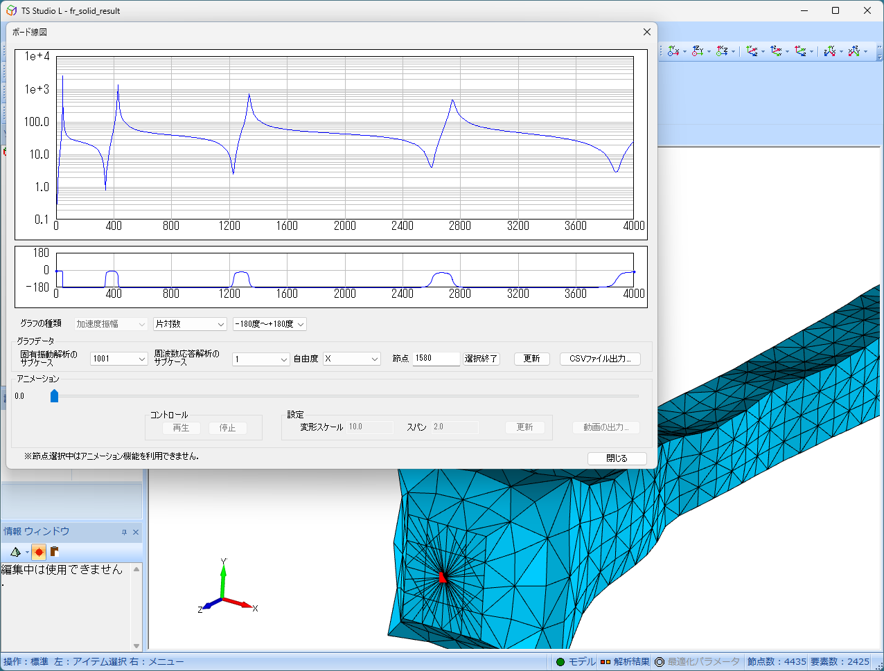 周波数応答解析の結果のボード線図やアニメーションを確認することが可能です。